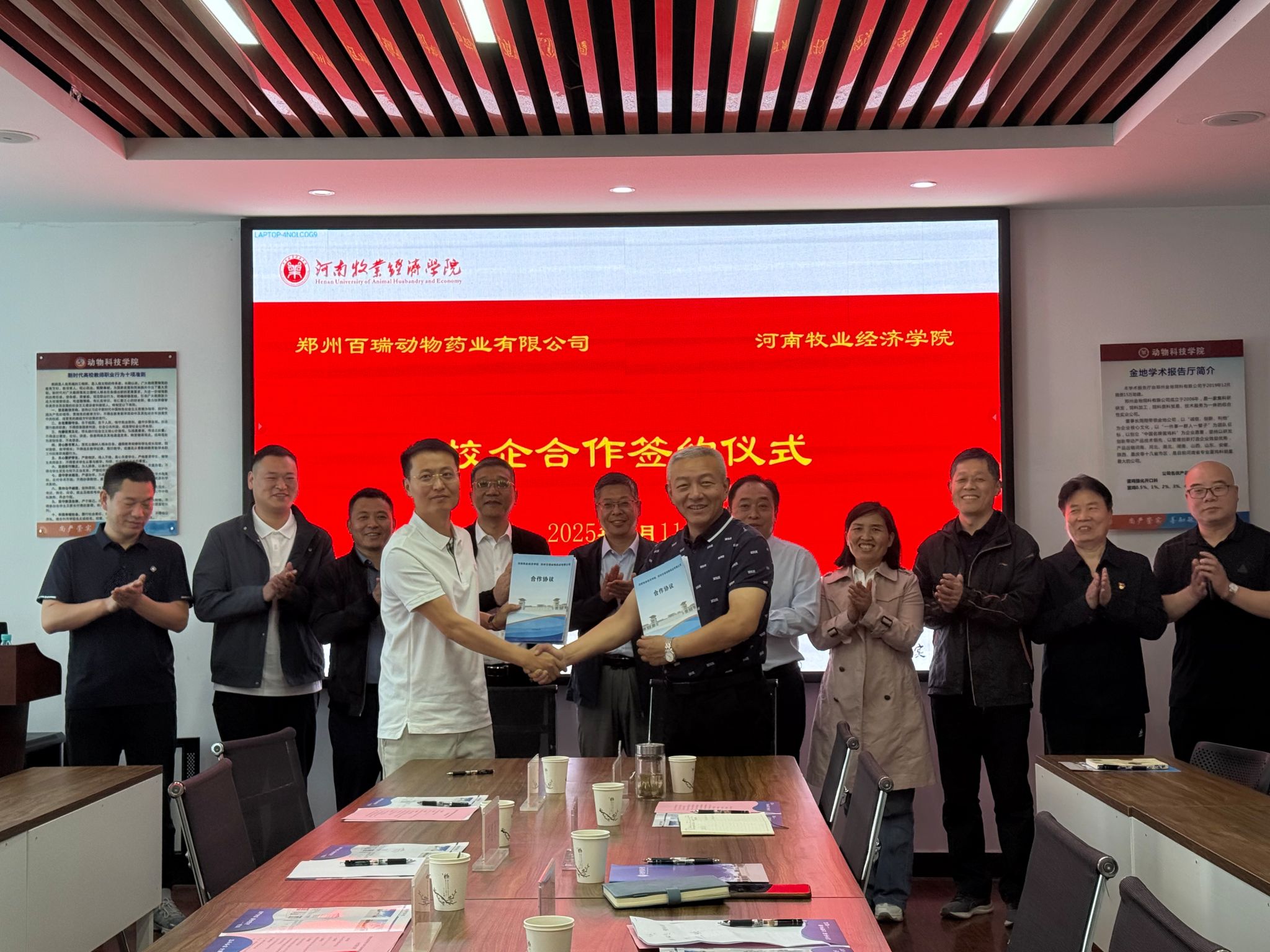 4月11日上午,鄭州百瑞動物藥業(yè)有限公司總經(jīng)理陳盟一行5人到動物科技學(xué)院洽談校企合作,學(xué)校社會服務(wù)辦公室主任胡華鋒、動物科技學(xué)院副院長鄧紅雨(主持工作)以及學(xué)院相關(guān)專業(yè)負(fù)責(zé)人參加座談,并舉行了校企合作簽約儀式。